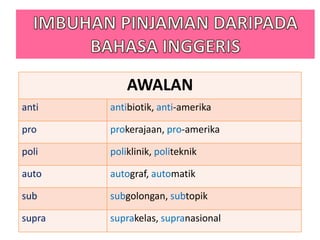 . Lihat contoh kata pinjaman terjemahan dalam ayat dengar sebutan. Imbuhan pinjaman daripada bahasa inggeris Awalan anti - antibiotik pro - prokerajaan poli - poliklinik politeknik auto - autograf automatik sub - subgolongan subtopik. Ada tiga golongan imbuhan asing dalam bahasa Melayu iaitu imbuhan Sanskrit imbuhan Arab-parsi dan imbuhan Inggeris.